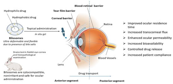 From all these reported studies it can be concluded that bilosomes are efficient in ocular drug delivery due to increased transcorneal flux, prolonged corneal contact time, controlled ocular delivery, and improved bioavailability due to the ultra-deformable and flexible properties of bilosomes, as depicted in Figure 3. Bilosomal formulations are also reported to be safe and non-irritant for ocular administration [49,50]. Using the traditional ocular delivery system, the distribution of the drug in the target tissue is limited and its therapeutic levels are rapidly lost due to several precorneal, dynamic, and static barriers. In this regard, bilosomal formulations open up a huge possibility as a means of improving and extending eye care treatment.