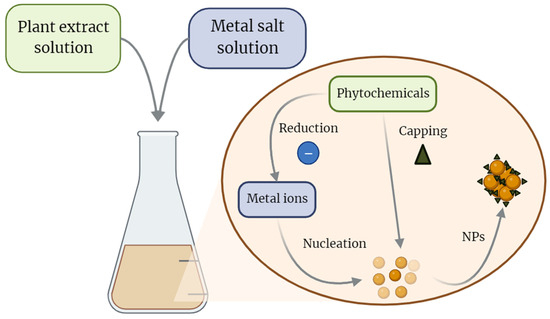 The green synthesis of NPs refers to using biological materials as the capping agents to improve the form, functionality, and stability of NPs [32]. The process of green-synthesizing NPs is illustrated in Figure 1.