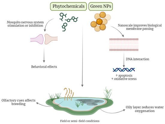 Action mechanisms of plant extracts and plant-derived nanoparticles. In the left panel, we summarize the phytochemicals’ effects. These molecules are recognized for their larvicidal and mosquitocidal properties, modulating the mosquito nervous system, by inducing either overstimulation or inhibition. This neuro-modulation results in observable behavioral changes, such as the reduced swimming and restless movement of larvae. In the right panel, effects of green nanoparticles (NPs) are illustrated. NPs with their optimal size effortlessly penetrate the membranes of mosquitos. Their mechanism of action involves interactions with DNA, contributing to enhanced apoptosis and oxidative stress within the target organisms. Notably, when deployed in field or semi-field conditions, these nanoparticles form an oily layer, a phenomenon correlated with a reduction in water oxygenation. Furthermore, both phytochemicals and green NPs influence factors such as the attraction of female mosquitoes to breeding sites, which are guided by olfactory cues susceptible to water quality. The effects of green-synthesized NPs may be due to the known effects of biomolecules present in plant extracts.