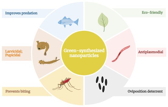 In addition, the green nanotechnology strategy can promote a biological form of vector control because most plant extracts can increase the predatory activity of non-target organisms against the early developmental stages of the mosquito. For instance, chitosan-synthesized Ag NPs increased the predation efficacy of Danio rerio against larvae of A. stephensi at a concentration of 1 ppm [64]. Citrus limon gold–palladium (Au-Pd) NPs had no negative impact on the predatory habit of flying insects, which increased over time [98]. Likewise, Lagenaria siceraria zinc oxide (ZnO) NPs increased P. reticulata predation efficacy from 45.8% in the aqueous extract to 61.13% [99]. Also, Cymbopogon citratus Au NPs boosted Mesocyclops aspericornis predation against A. stephensi from 26.8 to 45.6% [100]. The predation efficacy improvement could be due to the decreased mobility of larvae, which are typically fast-paced, after exposure to the green-synthesized NPs [98]. Additionally, Ag NPs synthesized with Ichnocarpus frutescensi [101], Rubus ellipticus [102], Naregamia alata [103], and Hugonia mystax [104] had a negligible toxic effect on non-target aquatic organisms, such as G. affinis, Diplonychus indicus, and Anisops bouvieri. Solanum xanthocarpum-synthesized Ag NPs [105] and Momordica charantia leaf extract TiO2 NPs [106] had no toxicity against P. reticulata at the same concentrations lethal to mosquitos. It is crucial to outline the choice of material used to synthesize NPs because CdS showed toxicity against non-target aquatic organisms [107]. These are predators of mosquito breeding sites, hence the importance of developing insecticides harmful only to the intended species to maintain the ecologic niche balance. Malva sylvestris Ag NPs were not toxic to D. indicus and G. affinis, as the longevity and swimming habits did not change after exposure to NPs, and the suitability index showed that treatment with NPs was more toxic to the mosquito larvae [108].