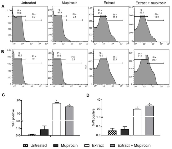 The synergism between the extract and mupirocin may be attributed to the increase in membrane permeability resulting from the extract treatment. This result was observed in the flow cytometry using the propidium iodide (PI) assay. When PI passes through the membrane and binds to DNA, it emits fluorescence, which can be quantified using the flow cytometry technique [39]. PI penetration is directly related to the loss of structural integrity and, consequently, to the impairment of the transport function across the plasma membrane [40,41].