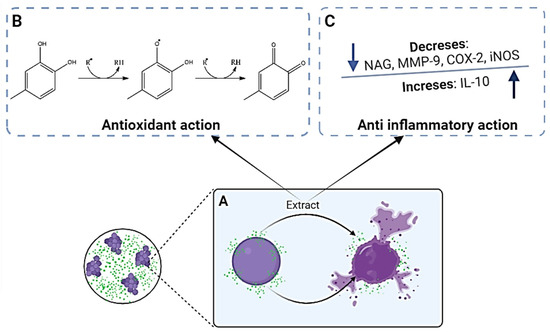 Schematic representation of the mechanism of antibacterial (A), antioxidant (B), and anti-inflammatory (C) actions of the hydromethanolic extract of Protium spruceanum.
