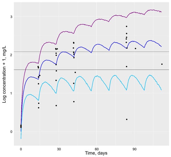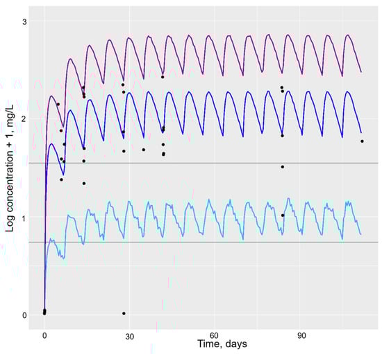 Simulation of the etanercept biosimilar PK profile for 10,000 individuals using the final popPK model. Legend: Horizontal grey lines represent the etanercept therapeutic window of 2.1–4.7 mg/L proposed by Jamnitski et al. []. The dark blue line represents the population median, the light blue line represents the 5th percentile and the purple line represents the 95th percentile of the population. The black dots represent actual population drug concentration values.