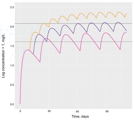 Alternative dosing regimens were also simulated for typical individuals on the etanercept biosimilar (Figure 4). All simulated doses achieved steady-state drug concentrations well above the therapeutic window of etanercept, defined as between 2.1–4.7 mg/L []. Time to steady-state drug concentrations had negligible differences between the three simulated dosing regimens of the etanercept biosimilar, although this was marginally quicker with an interval of every 10 days on visual inspection.