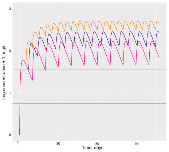 Simulated usual and alternative dosing intervals of the adalimumab biosimilar for a typical patient. Legend: Horizontal grey lines represent the adalimumab therapeutic window of 5–8 mg/L proposed by Pouw et al. []. The purple line represents the usual adalimumab biosimilar dosing interval of 40 mg every 14 days, the orange line represents a dosing interval of 40 mg every 7 days and the pink line represents 40 mg every 21 days.