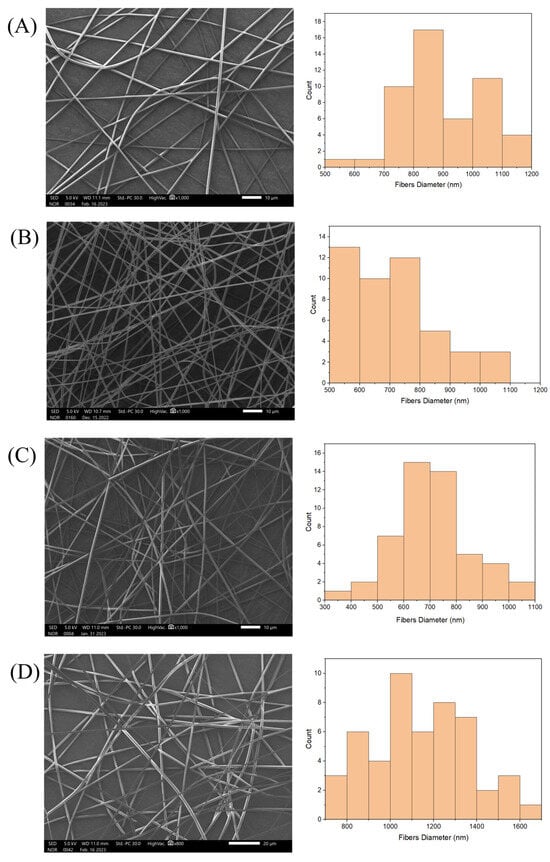 SEM images and diameter distributions of different electrospun NFs: (A) plain NFs, (B) AT NFs, (C) DB NFs, and (D) DB-AT NFs.