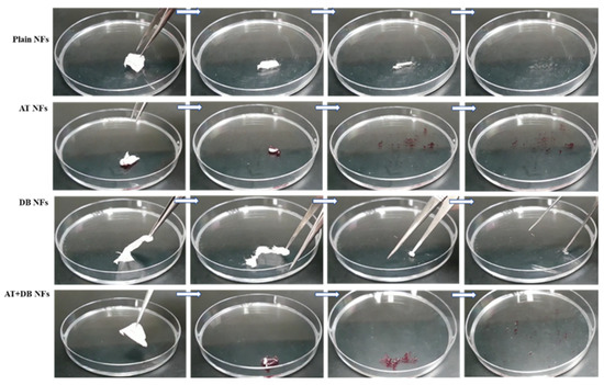 As depicted in Figure 2, four types of electrospun NFs were added to PBS (7.4). Both plain and AT NFs exhibited rapid dissolution in less than 2 s, whereas the DB NFs and DB-AT NFs were dissolved in more than 30 s despite using the hydrophilic polymer PVP. The obtained NFs initiated the dissolution process by transforming into a gel-like material, eventually dissolving completely. The extended dissolution duration observed in NFs containing DB might be due to the pronounced hydrophobic nature of DB as evident in Figure 2 since the extract exhibits a violet color. The quick solubility of the obtained NFs could be attributed to the employed polymer, i.e., PVP, the nanoscale porosity, and the large surface area of the electrospun NF matrix [30]. Additionally, this rapid dissolution of the electrospun NFs could contribute to the fast drug release rate and efficient wound-healing outcomes. This distinctive property of NFs may contribute to keeping the wound in a moist environment for efficient wound healing, which would enhance the therapeutic efficacy of the loaded extracts [31].