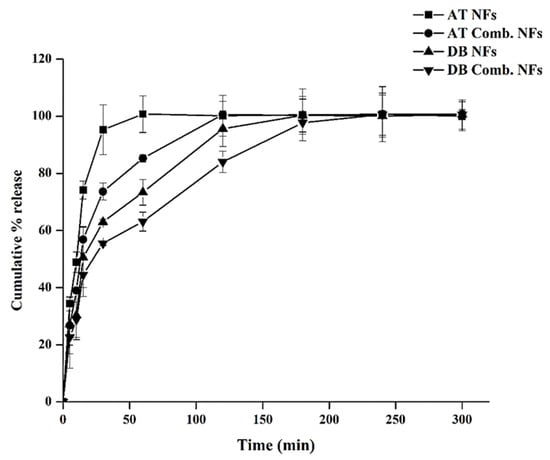 The AT-, DB-, and their combined-loaded NFs exhibited a rapid initial burst release within the first 10 min for both the AT and DB NFs (Figure 4). This phenomenon was anticipated due to the hydrophilic nature of the PVP polymer, which facilitated the dissolution of the NFs and accelerated the release of the loaded drugs [27,28]. After 30 min, the release of AT NFs and DB NFs was approximately 70% and 62%, respectively, while the release of DB-AT from the NFs was approximately 59% for AT and 46 for DB. After 60 min, the release of the AT NFs and DB NFs reached the maximal level with about 100% and 73% for AT and DB, respectively, while the release of DB-AT from the NFs was about 84% for AT and 60% for DB. The release for all NFs (~100%) was detected after 180 min (Figure 4).