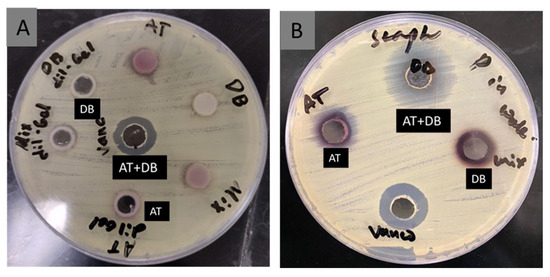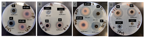 Antibacterial activity of AT, DB, and AT + DB extracts against P. aeruginosa (A,B) and S. aureus (C,D).