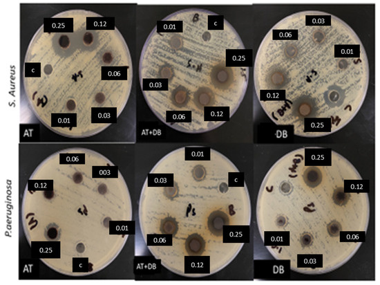 MIC of the DB-, AT-, and DB-AT-loaded NFs was also tested through agar diffusion assay against S. aureus and P. aeruginosa (Table 2). The starting concentration of the NFs was 0.25% w/v, followed by double-fold serial dilution, which was then carried out across the plate. The lowest concentration was 0. 01% w/v. As shown in Figure 7, the MIC values against P. aeruginosa were determined as follows: 0.25% w/v for the AT NFs, 0.06% w/v for the DB NFs, and 0.03% w/v for the DB-AT NFs, which corresponded to concentrations of 80 µg/mg for the AT NFs and 22 µg/mg for the DB NFs, while the DB-AT NFs had 10 µg/mg of DB and 8.5 µg/mg of AT.