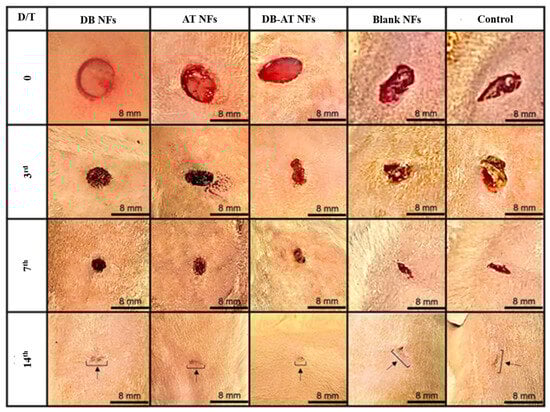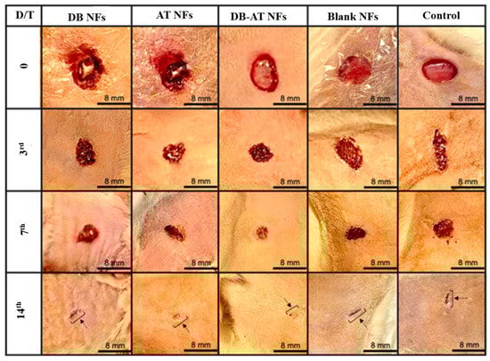 Thus, the DB-AT NFs continued to demonstrate superior healing rates compared to the other groups of treatments. Overall, the treatment with the DB-AT NFs resulted in improved healing rates and wound closure.