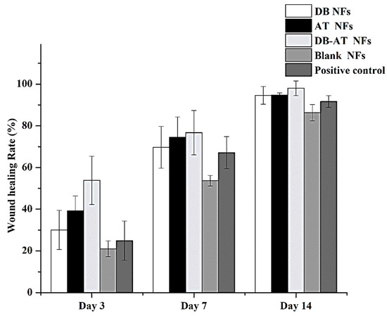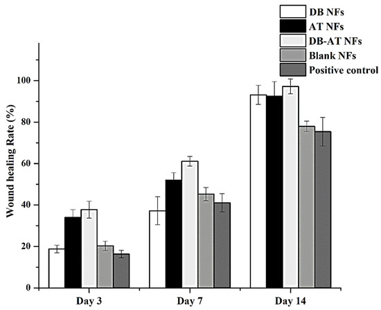 In vivo wound-healing rate using DB-AT NFs at 3, 7, and 14 days.