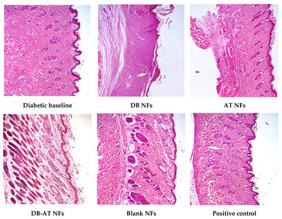 It is important to note that the healing rate in the control rats is better than in the diabetic rats. This behavior of diabetes is due to physiological complications such as impaired blood flow, a weakened immune system, and increased oxidative stress, which lead to delayed healing [38]. The results suggest that the wound-healing rate was in the order of the DB-AT NFs > DB NFs > AT NFs > positive control > blank NFs, indicating that the DB-AT NFs are more effective for diabetic wound-healing.