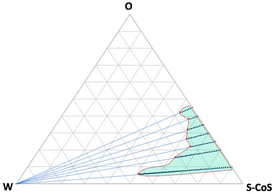 From our previous experience, different proportions of water were incorporated by titration in a system where the oily phase consisted of a commercially available CBD oil for topical use containing CBD at a dose of 20% w:v, with hemp oil as the main vehicle. As previously described, each mixture was titrated carefully under continuous stirring at a temperature of 30 °C to achieve equilibrium of liquid phases, taking care not to incorporate air bubbles into the formulation. The obtained preparation was then visually assessed for transparency and further titrated over the entire phase region. Figure 1 shows the pseudo-ternary phase diagram for all the mixtures described in Table 1 and the titration lines.