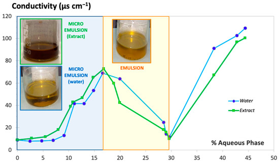 The resulting conductivity-vs.-water or aqueous extract content plot showed a clearly different zone in both cases (light blue background on the left side of Figure 2) in which an increase of conductivity was obtained with up to 4 mL of hydrophilic phase added to the oily phase containing the surfactant/cosurfactant; the resultant formulation showed behavior clearly indicative of a microemulsion system. Conductivity values decreased dramatically when the volume of hydrophilic phase added during the titration ranged from 4 to 8.5 mL (light yellow background zone of the plot) as a result of the formation of a thicker and opaque system denoting the formation of an emulsion. Volumes of water greater than 8.5 mL (white zone of the plot) resulted in a new increase of conductivity associated with the breakage of the emulsion, which resulted in the formation of two separate phases. It was observed that the physical behaviors of the systems including water or the aqueous extract were practically identical.