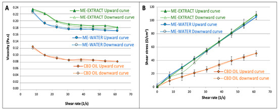 Viscosity-vs.-shear rate profiles showing the mean viscosity value (A), and shear stress-vs.-shear rate upward and downward rheograms (B).