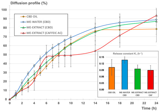 The in vitro release studies were performed to characterize the release of CBD from the commercially available CBD oil and to elucidate whether or not the creation of a microemulsion system could modify significantly the retention or release of the CBD in comparison to its behavior in the original CBD oil. The release of CBD from the oil phase was studied concomitantly with the release of CAF from the aqueous phase, as CAF was used as a model hydrophilic antioxidant compound found in the S. ebulus extract and here used in the microemulsion.