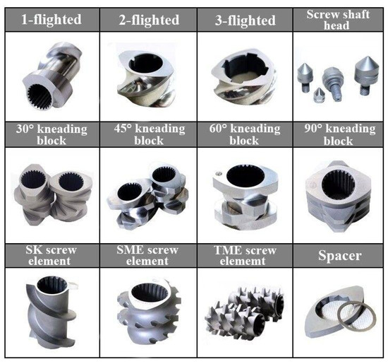 - Kohlgrüber, K. 2—Basics—Screw Elements. In Co-Rotating Twin-Screw Extruders: Fundamentals; Kohlgrüber, K., Ed.; Hanser: Munich, Germany, 2020; pp. 101–188. [Google Scholar]