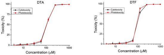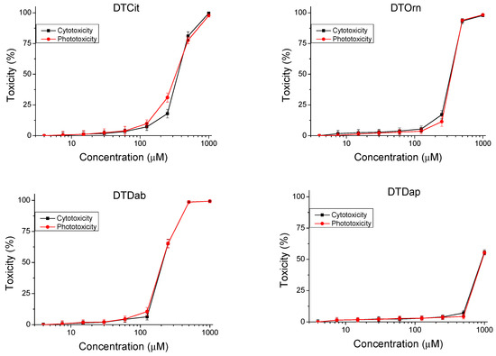 Literature data indicated that temporins are toxic to normal mammalian cells within IC50 concentrations of 50 μM to 100 μM [25,26]. This is a significantly higher concentration than the concentrations at which antibacterial activity is observed [27,28]. However, methods and possibilities are being sought to modify temporins in order to increase their safety. Four of the investigated peptide analogues of Temporin A (DTCit, DTOrn, DTDab, and DTDap) showed significantly lower cytotoxicity than the original peptide (DTA). Furthermore, the photosafety test showed that the investigated peptide analogs were not phototoxic. These results show that the indicated peptides have the potential to be used safely for topical and systemic applications.