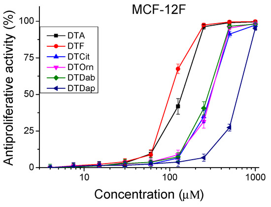 An antiproliferative activity test was performed on human cell lines, an in vitro model of healthy tissue and two types of breast cancer. The original peptide (DTA) and that substituted in the seventh position with Lys peptide (DTP) caused the highest antiproliferative effect in the cell line MCF-7 (luminal type A breast cancer). We also observed selectivity (SI > 2) with the Citrulline-substituted peptide (DTCit). In contrast, the investigated peptide analogs did not show selectivity (SI < 2) against basal type B breast cancer (MDA-MB-231 cell line). These results support the literature data on the antitumor activity of positively charged temporins and their analogues [29,30], where the authors studied different types of tumor cell lines (A549, MCF-7, MDA-MB-231). A panel of different types tumor cell lines could also be tested for more information about their antiproliferative properties.