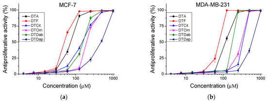 Antiproliferative activity of peptides determined in tumor cell lines (a) MCF-7 and (b) MDA-MB-231 (in vitro model of breast cancer). Values are means ± SD, n = 6.