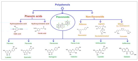 Polyphenolic acids are classified into two categories, benzoic acid and cinnamic acid derivatives. Several subclasses of non-flavonoids and flavonoids have general molecular structures: A, B, and C (Figure 1). A few examples of polyphenols are structurally represented here along with their classification [,].