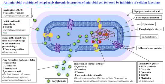 Of the most biologically active polyphenols, few of their antibacterial, antiviral, antifungal, etc., properties have been described. Here are a few instances of polyphenols and their listed antimicrobial properties, also reviewed in tabular form [,]: