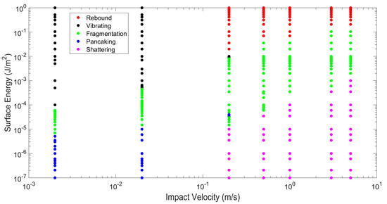 The classification of post-impact particle behavior over a range of surface energies and impact velocities is shown in Figure 1. Generally, at higher impact velocities, as the surface energy increases, the post-impact particle behavior transitions from shattering to fragmentation to rebound. At a higher surface energy, constituent particles are held tightly together, and the agglomerate remains unbroken. When the surface energy is decreased, constituent particles are more loosely held together, and the impact kinetic energy more easily breaks the adhesive bonds between constituent particles. However, when the impact velocity is low, post-impact particle behavior transitions from pancaking to fragmentation to vibration. In this case of low impact velocity and low surface energy, there is not sufficient impact kinetic energy to both break adhesive bonds and propel the largest particle fragment from the wall. Hence, the largest particle fragment remains on the plate. As the surface energy increases at lower impact velocity, fewer particle bonds are broken and there is sufficient remaining impact kinetic energy to propel particle fragments from the wall. When the surface energy is high and the impact velocity is low, no particle bonds are broken, but the initial agglomerate remains intact and engages in repeated impacts with the wall (vibration regime).