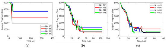 Reproducibility of size of largest fragment after impact with varying impact velocity (a) 1 m/s, (b) 3 m/s, and (c) 5 m/s. Surface energy = 0.02 J/m2. The y-axis represents the number of constituent (or primary) particles in the largest fragment and N indicates the total number of fragments at steady state.