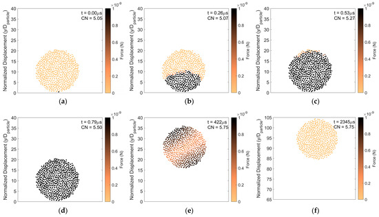 Particle rebound. Force distribution and average coordination number of constituent particles (a) 0 μs, (b) 0.21 μs, (c) 0.53 μs, (d) 16 μs, (e) 28 μs, and (f) 115 μs after initial impact. Surface energy 1 J/m2 and impact velocity 5 m/s.