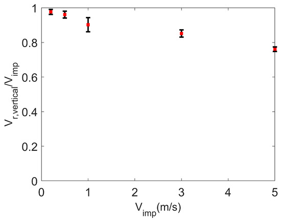 The coefficient of restitution of the agglomerate—the ratio of the vertical rebound velocity to the impact velocity—is shown as a function of impact velocity in Figure 5. The error bars in the figure represent the deviation in rebound velocity for the agglomerate impacting the plate on different points on the agglomerate surface. The coefficient of restitution decreases with increasing velocity, as observed in the experimental measurements of Hassani-Gangaraj et al. [13]. As the impact velocity increases, more of the energy associated with the impact is absorbed in compacting the agglomerate and less is contributing to the particle rebound.