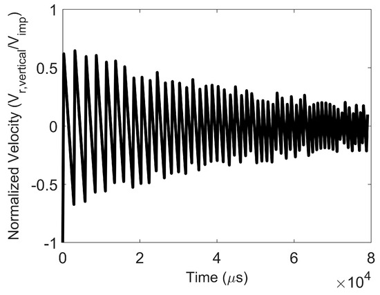 Particle vibration. Evolution of normalized vertical velocity (ratio of vertical component of rebound velocity to impact velocity) with time after impact. Surface energy = 0.02 J/m2 and impact velocity 0.02 m/s.