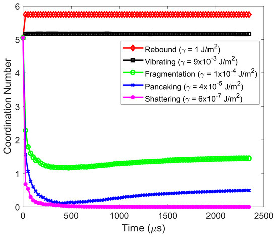 The particle vibration regime is present at lower impact velocities. In such cases, as the surface energy is decreased at a fixed impact velocity, the particle remains intact, but the post-impact average coordination number decreases with decreasing surface energy. In addition, the particle rebound velocity decreases to such an extent that it engages in many low-velocity collisions with the wall. In the vibration regime, the rebound velocity decreases rapidly with time due to numerous inelastic collisions with the wall, as shown in Figure 6. In the vibration regime, the average coordination number of particles within the agglomerate (Figure 7) and force on the constituent particles in the agglomerate at steady state post-impact are only minimally higher than those pre-impact.