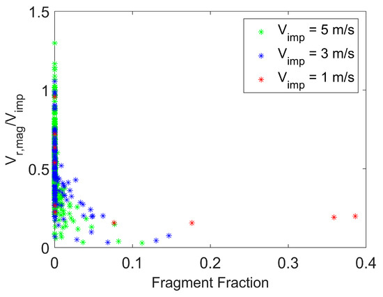 Particle fragmentation. Magnitude of the rebound velocity (considering all three velocity components) scaled by the impact velocity as a function of fragment size for varying impact velocity. Surface energy = 0.02 J/m2. Time = 63 μs.