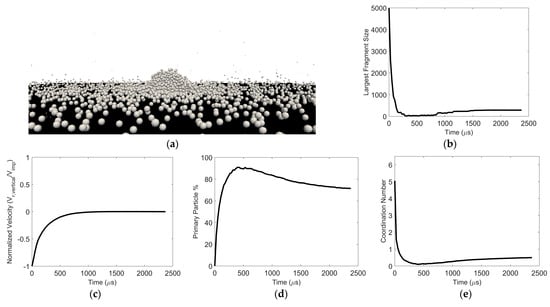 Particle pancaking. (a) Image of resulting fragments (b) Largest fragment size, (c) normalized vertical velocity, (d) constituent particle percentage, and (e) average coordination number as a function of time. Surface energy = 4 × 10−5 J/m2 and impact velocity = 0.2 m/s.