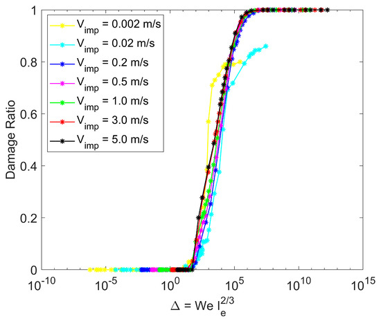 All the simulation data obtained in this study are scaled in the manner given by this mechanistic model and shown in Figure 13. The predicted damage ratio scales with the dimensionless parameter ∆ for all impact velocities and surface energies except at the lowest impact velocities with low surface energies (larger values of ∆). These conditions correspond to the pancaking regime but represent conditions less likely to be observed in practice.