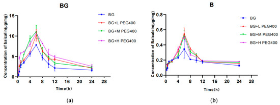 The results of the intracellular pharmacokinetic experiments indicated that PEG400 could facilitate the rapid absorption of the substrate drug baicalin, thereby initiating the production of metabolites B and B6G. PEG400 could increase the cellular uptake of baicalin, increase the Cmax, AUC0–t, and Tmax of baicalin and its metabolites B and B6G, decrease the absorption of baicalin in cells, and promote the conversion of baicalin to baicalein, thus producing BG and B6G. It is suggested that PEG400 may activate the related phase II metabolic enzymes. A previous study by the group showed that PEG400 had a significant promoting effect on UGT1A8 and UGT1A9 [39,40].