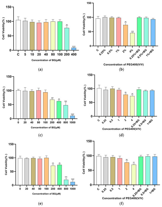 The following supporting information can be downloaded at: https://www.mdpi.com/article/10.3390/pharmaceutics16060731/s1, Figure S1: The SRM chromatogram of BG, B, B6G in cell lysate; Figure S2: The effect of different concentrations of PEG400 on the survival of HepG2 cells. Compared to the control group, ** p < 0.01 ( ± s, n = 5).