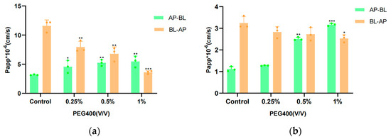 In this experiment, a 100 μM baicalin solution (dissolved in HBSS) containing different concentrations of PEG400 (0.25%, 0.5%, and 1%) was employed as the test solution, while a solution without PEG400 was used as the blank test solution, which was added to AP or BL chambers, respectively. In the top to basolateral (AP-BL) transport experiment, the 0.5 mL sample added to the apical side (AP) was utilized as the supply room, and the HBSS preheated to 1.5 mL 37 °C was added to the basolateral (BL) as the receiving chamber. Conversely, in the basal low lateral to top (BL-AP) transport experiment, the 1.5 mL sample (dissolved in HBSS) was added to the BL side as the supply room, and the 0.5 mL preheated HBSS was added as a receiving room on the AP side. Once the aforementioned steps had been completed, the transwell was placed on a 37 °C thermostatic oscillator at 60 r/min, and 100 μL was withdrawn from the receiving cell or 10 μL from the supply chamber at 30, 60, 90, and 120 min, depending on the experiment, and replenished with an equal volume of blank 37 °C preheated HBSS. The samples were utilized to precipitate the proteins with 100 μL of methanol containing the internal standard for 10 min. After centrifugation at 16,000× g for 15 min at 4 °C, the supernatant was collected in a volume of 70 μL. The contents were determined by UPLC-MS/MS, and apparent permeability coefficients (PAPP) and efflux ratios (ER) were calculated.