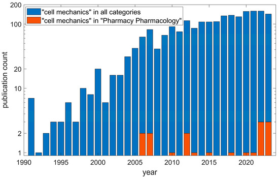 Despite this, research activity remains low, and only a couple of papers, if any, are published on cell mechanics in pharmacy each year, while cell mechanics overall has hundreds of papers published per year, according to the Web of Science (