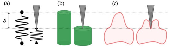 - Lacaria, L.; Podestà, A.; Radmacher, M.; Rico, F. Contact Mechanics. In Mechanics of Cells and Tissues in Diseases: Biomedical Methods: Volume 1; De Gruyter: Berlin, Germany, 2023; Volume 1, pp. 21–64. ISBN 9783110640632. [Google Scholar]