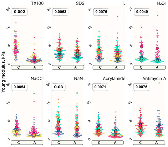 - Murashko, A.V.; Frolova, A.A.; Akovantseva, A.A.; Kotova, S.L.; Timashev, P.S.; Efremov, Y.M. The Cell Softening as a Universal Indicator of Cell Damage during Cytotoxic Effects. Biochim. Biophys. Acta Gen. Subj. 2023, 1867, 130348. [Google Scholar] [CrossRef] [PubMed]