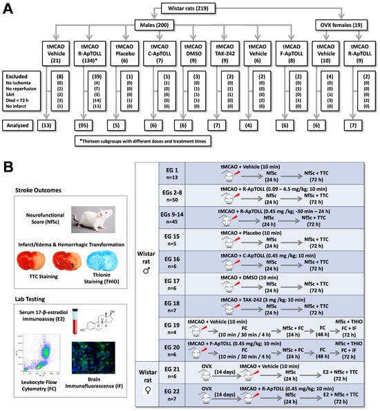CONSORT-style flow diagram and experimental schedule. (A) Progress of all rats included in the study. Rats were excluded from quantitative assessment of outcomes according to the following predefined criteria: (1) cortical perfusion (CP) did not drop after filament insertion (no ischemia); (2) CP did not recover at all after filament withdrawal (no reperfusion); (3) subarachnoid hemorrhage (SAH) during filament insertion/withdrawal; (4) death before 72 h; and (5) no TTC-detectable brain infarction in spite of a right ischemia–reperfusion pattern. OVX: ovariectomized; tMCAO: transient middle cerebral artery occlusion; R-ApTOLL, research-grade ApTOLL; C-ApTOLL, clinical-grade ApTOLL; F-ApTOLL, Alexa Fluor 488-conjugated ApTOLL. (B) Time course of the experimental schedule for each of the twenty groups of Wistar male rats (EGs1-20) and the two groups of female rats (EGs21-22), including procedures (OVX and tMCAO), treatments (vehicle, ApTOLL, and TAK-242), methods for stroke outcome assessment (NfSc: neurofunctional score; TTC: 2,3,5-triphenyl tetrazolium chloride staining; and THIO: thionin staining), and lab tests (E2: 17-β-estradiol immunoassay; FC: flow cytometry, and IF: immunofluorescence). The number of analyzed rats (n) is indicated.