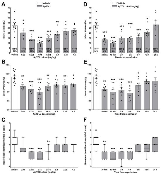 Cerebroprotective effects of ApTOLL in male Wistar rats subjected to transient middle cerebral artery occlusion (tMCAO). (A–C) Dose-dependent effects of ApTOLL (0.09, 0.225, 0.45, 0.675, 0.9, 2.25, and 4.5 mg/kg), i.v. 10 min post-tMCAO, on infarction, including the absolute and relative occurrence of hemorrhagic transformation (HT), (A) and edema volumes (B), as well as on neurofunctional impairment (C), at 72 h after tMCAO. (D–F) Therapeutic time window for the effects of ApTOLL (0.45 mg/kg), i.v. injected before (−30 min) or after (+10 min, +2 h, +6 h, +9 h, +12 h, and +24 h) tMCAO, on infarction, including the absolute and relative HT occurrence, (D) and edema volumes (E), as well as on neurofunctional impairment (F), at 72 h after tMCAO. Data are means ± SEM (A,B,D,E) and median [Q1, Q3] (C,F). Statistical analysis: one-way ANOVA followed by Dunnett’s multiple comparisons post hoc test (A,B,D,E) and Kruskal–Wallis test followed by Dunn’s multiple comparisons post hoc test (C,F). Significantly different from vehicle (* p < 0.05, ** p < 0.01, and *** p < 0.001).