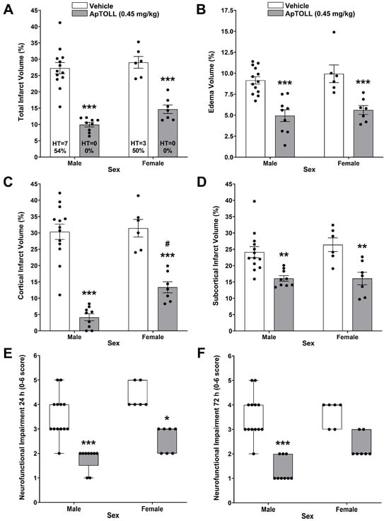 Sex-dependent cerebroprotective effects of ApTOLL in Wistar rats subjected to transient middle cerebral artery occlusion (tMCAO). Comparative effects in male and female rats of ApTOLL (0.45 mg/kg), i.v. 10 min post tMCAO, on total infarction, including the absolute and relative occurrence of hemorrhagic transformation (HT), (A) and edema volumes (B); on cortical (C) and subcortical (D) infarct volumes, at 72 h after tMCAO; and on neurofunctional impairment at 24 h (E) and 72 h (F) after tMCAO. Data are means ± SEM (A–D) and medians [Q1, Q3] (E,F). Statistical analysis: two-way ANOVA followed by Sidak’s multiple comparisons post hoc test (A–D) and a Kruskal–Wallis test followed by Dunn’s multiple comparisons post hoc test (E,F). Significantly different from vehicle (* p < 0.05, ** p < 0.01, and *** p < 0.001). Significantly different from ApTOLL in males (# p < 0.05).