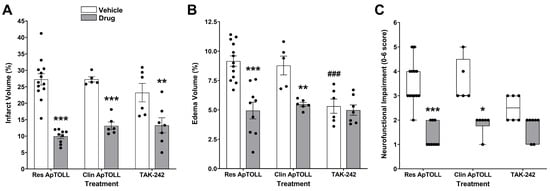 Cerebroprotective effects of clinical-grade ApTOLL and the TLR4 inhibitor TAK-242 in male Wistar rats subjected to transient middle cerebral artery occlusion (tMCAO). Comparative effects of research-grade ApTOLL (Res ApTOLL, 0.45 mg/kg; i.v.), clinical-grade ApTOLL (Clin ApTOLL, 0.45 mg/kg; i.v.), and TAK-242 (3 mg/kg; i.p.), 10 min post-tMCAO, on infarct (A) and edema volumes (B), as well as on neurofunctional impairment (C), at 72 h after tMCAO. Data are means ± SEM (A,B) and medians [Q1, Q3] (C). Statistical analysis: two-way ANOVA followed by Sidak’s multiple comparisons post hoc test (A,B) and a Kruskal–Wallis test followed by Dunn’s multiple comparisons post hoc test (C). Significantly different from vehicle (* p < 0.05, ** p < 0.01, and *** p < 0.001). Significantly different from Res ApTOLL vehicle (### p < 0.001).