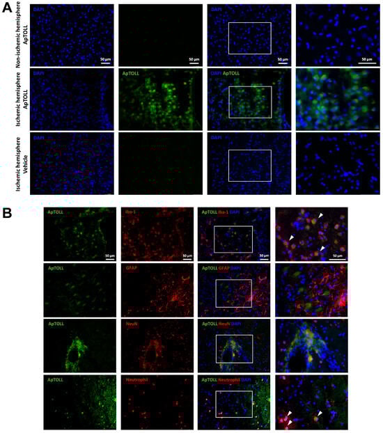 Brain slices of animals treated with Alexa Fluor 488-conjugated ApTOLL (0.45 mg/kg) or vehicle, 10 min post tMCAO, were obtained at 72 h and observed via microscopy immunofluorescence. Alexa Fluor 488-conjugated ApTOLL was present in the ischemic hemisphere, but not in the non-ischemic hemisphere of ApTOLL-treated animals, nor in the ischemic hemisphere of vehicle-treated animals (Figure 6A).