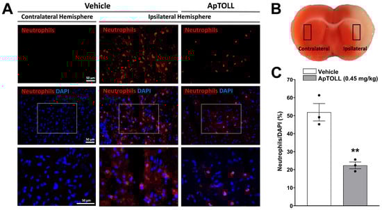 Effect of ApTOLL on neutrophil infiltration in the brain of male Wistar rats subjected to transient middle cerebral artery occlusion (tMCAO). (A) Representative immunofluorescence images of the brain ischemic (ipsilateral) hemisphere of animals treated with ApTOLL (0.45 mg/kg) i.v. 10 min post tMCAO or the vehicle at 72 h after tMCAO and of the non-ischemic (contralateral) hemisphere treated with the vehicle, with immunolabeling for neutrophils. Nuclei were counterstained with 4′,6-diamidino-2-phenylindole (DAPI). (B) Representative TTC-stained brain slice showing the localization of immunofluorescence images. TTC: 2,3,5-triphenyl tetrazolium chloride. (C) Quantitative effect of ApTOLL on the density of infiltrated neutrophils in the ischemic hemisphere. Data are means ± SEM. Statistical analysis: Student’s t-test. Significantly different from vehicle (** p < 0.01).