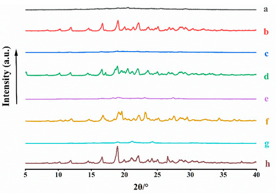 PXRD patterns of (a) ACM-AM, (b) ACM, (c) ACM-Lys, (d) PM-Lys, (e) ACM-Arg, (f) PM-Arg, (g) ACM-His, and (h) PM-His.