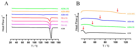 DSC thermograms (A) and the second heating DSC curves (B) of ACM-His, ACM-Lys, ACM-Arg, PM-His, PM-Lys, PM-Arg, and ACM.